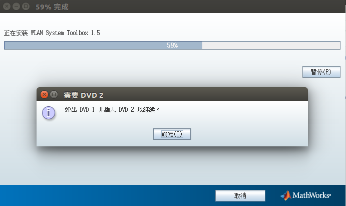 安装进度到“59%”时,会提示“弹出DVD1并插入DVD2以继续”的提示对话框
