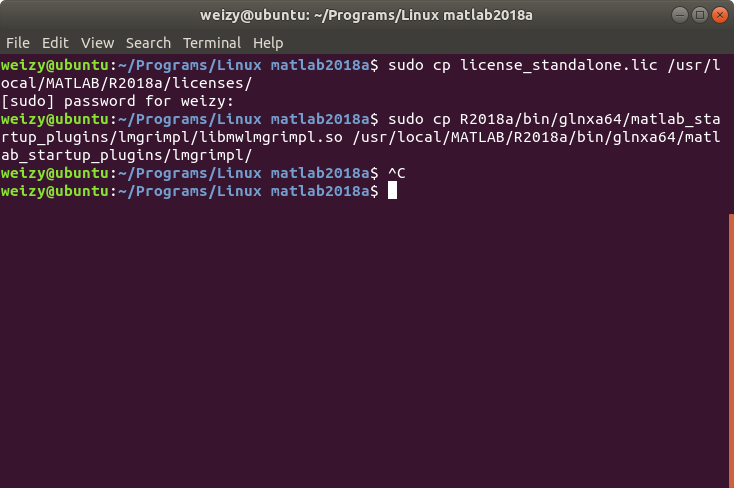 $ sudo cp license_standalone.lic /usr/local/MATLAB/R2018a/licenses/