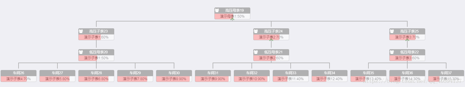 "data": [{"children": [{"children": [{"children": [{"children": [],"name": "车间26","title": "演示子表4:70%"},{"children": [],"name": "车间27","title": "演示子表5:80%"},{"children": [],"name": "车间28","title": "演示子表6:80%"},{"children": [],"name": "车间29","title": "演示子表7:80%"},{"children": [],"name": "车间30","title": "演示子表8:90%"}],"name": "低压母表20","title": "演示子表1:50%"}],"name": "高压子表23","title": "演示子表1:60%"},{"children": [{"children": [{"children": [],"name": "车间31","title": "演示子表9:90%"},{"children": [],"name": "车间32","title": "演示子表10:90%"},{"children": [],"name": "车间33","title": "演示子表11:40%"},{"children": [],"name": "车间34","title": "演示子表12:40%"}],"name": "低压母表21","title": "演示子表2:60%"}],"name": "高压子表24","title": "演示子表2:70%"},{"children": [{"children": [{"children": [],"name": "车间35","title": "演示子表13:40%"},{"children": [],"name": "车间36","title": "演示子表14:30%"},{"children": [],"name": "车间37","title": "演示子表15:30%"}],"name": "低压母表22","title": "演示子表3:60%"}],"name": "高压子表25","title": "演示子表3:70%"}],"name": "高压母表19","title": "演示母表1:50%"}],