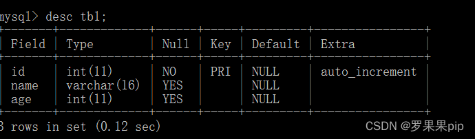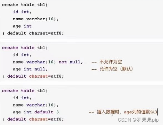 create table tb1(id int,name varchar(16),age int) default charset=utf8;
