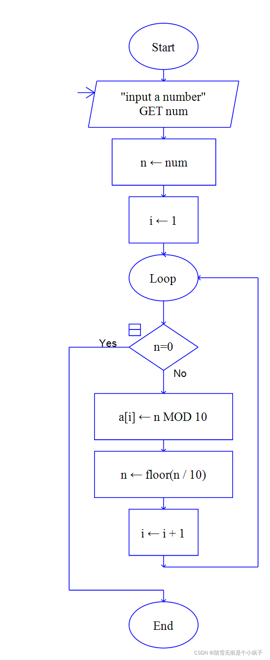 到这里,n 已经等于0了,已经完成了数字分解任务。通过上述分析可以发现,循环结束的条件就是临时变量 n = 0。通过把一些多次循环中不变的操作整合到循环里面,这样流程图的核心就有了,下面直接给出流程图。