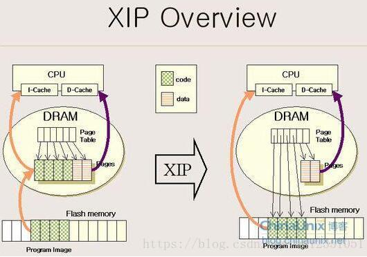 XIP,executed in place,本地执行。操作系统采用这种系统,可以不用将内核或执行代码拷贝到内存,而直接在代码的存储空间直接运行。采用这样的技术既可以节省可用内存又可以减少加载的时间。应用程序可以直接在flash闪存内运行,不必再把代码读到系统RAM中。flash内执行是指nor flash 不需要初始化,可以直接在flash内执行代码。但往往只执行部分代码,比如初始化RAM.比如在arm处理器中,Nor flash就存放了引导系统启动的Bootloader,不过大小比较小(仅2M空间)。