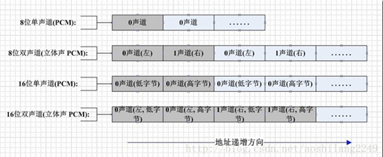 首先存储低有效字节,表示样本幅度的位放在i的高有效位上,剩下的位置为0,这样8位和16位的PCM波形样本的数据格式如下所示。