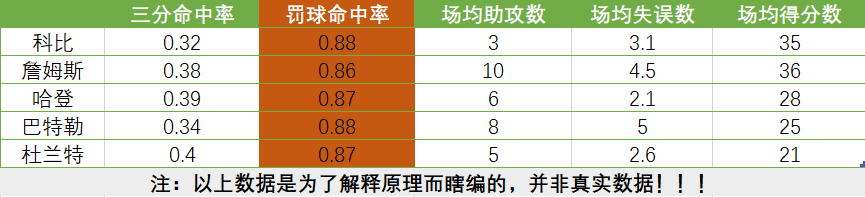 NBA要对5名球星:科比、詹姆斯、哈登、巴特勒、杜兰特进行综合实力评估。评估的指标体系是:三分命中率 罚球命中率 场均助攻数 场均失误数 场均得分数 。即用这5个指标来综合评估球员实力,虚拟数据如下: