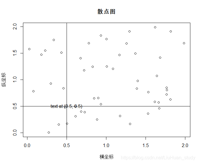y <- runif(50,0,2)#绘图:将主标题命名为“散点图”, 横轴命名为”横坐标”, 纵轴命名为“纵坐标”