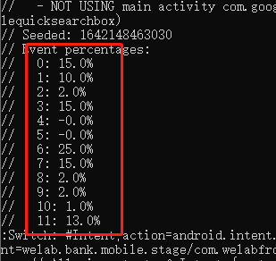 switch events percentage启动activity事件百分比。在随机的间隔里,Monkey会执行一个startActivity()调用,作为最大程度覆盖包中全部Activity的一种方法