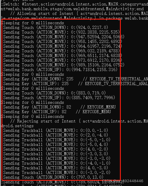 命令:adb shell monkey -p com.kmxs.reader -v -v 30 // 提供较为详细的日志,包括每个发送到Activity的事件信息