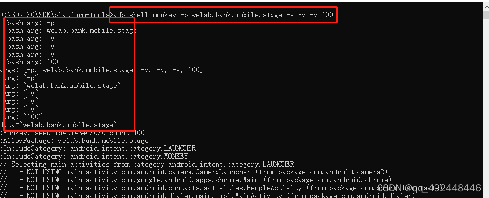 命令:adb shell monkey -p com.kmxs.reader -v -v -v 30 // 最详细的日志,包括了测试中选中/未选中的Activity信息