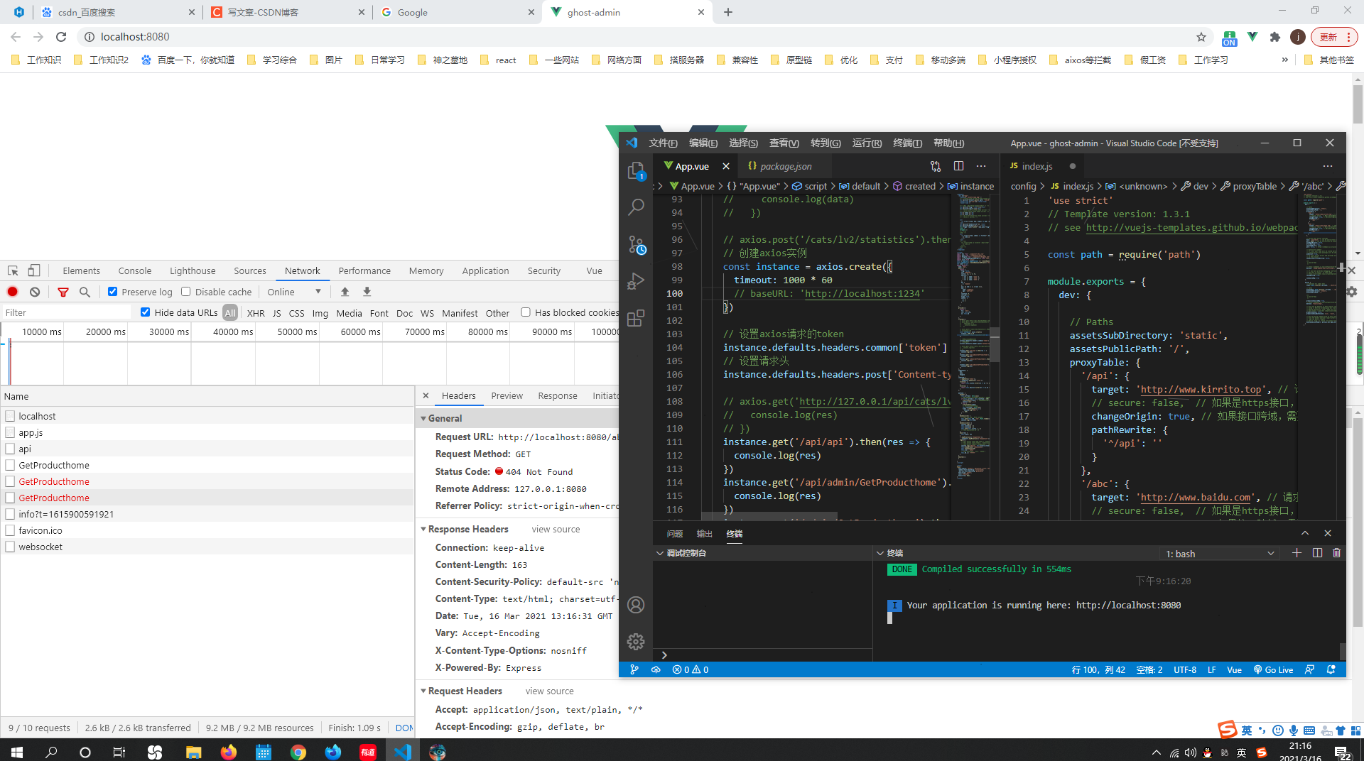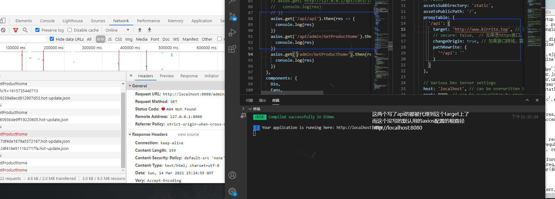 其次看这个,不设置axios的请求根路径(那么它默认就是项目根路径),然后会发现代理的部分都代理成功了,代理到了api的target来,请求的根路径代理成target了,没代理的部分,也就是没有写api去匹配上代理的,就用的项目根路径localhost:8080,跑不通