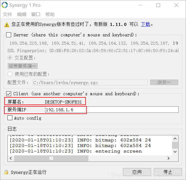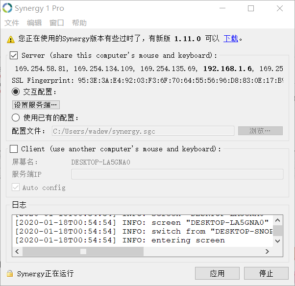 最后先点击被控电脑软件右下角的【开始】,再点击主控电脑Synergy右下角的【开始】【应用】,稍等片刻,看到Synergy窗口下方出现“Synergy正在运行”,就表示一切顺利,晃动一下鼠标,你就能看到鼠标从一个屏幕跑到另外一个屏幕上了!