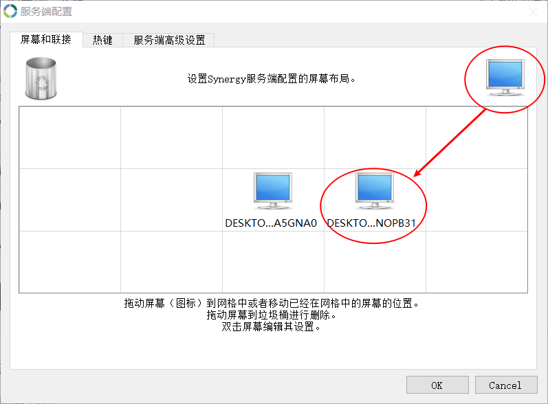 3.1先配置主控电脑。勾选Serve,代表这台电脑是主控电脑。可以看到serve下面的192.168.1.6被加粗了,后面这个地址要用来写在被控电脑的配置里,这里先不管。往下看,点击进入【设置服务端】,此步不能漏掉。从右上角拖动一个电脑图标下来到网格中,这一步是设置你两台电脑的左右上下屏幕关系