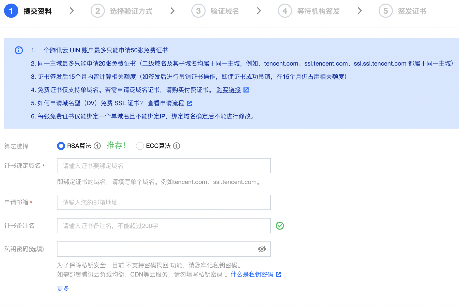 生成证书时可以选择算法,RSA和ECC都是非对称加密算法 ,这里选择的算法就是用来给浏览器和服务器之间传输的数据加密用的算法。注意,这里腾讯会帮你自动生成一对公私钥,公钥交给CA审核后写入证书里面,私钥以文件形式给用户。后面还有一个私钥密码,这个是自定义的一个密码,访问私钥时,需要先提供这个密码,他是给私钥上的一个保护方式,注意他并不是私钥。这样你的证书丢了以后,还是提供另外一个密码才能访问。另外这个配置在Tomcat中可以配置keystorePass: