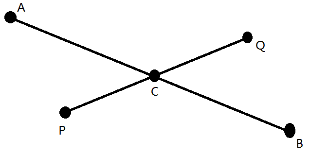 2):点 P 不在树的直径上,但假设存在不是 WQ 的树的直径 AB 与路径 PQ有一个交点 C,如下图。反证法:因为 PQ 为最远,所以 PC + CQ > PC + CA 进而可以得到 CQ > CA。不等式两边同时加上BC,得到 CQ + BC > CA + BC = AB。 这个结论与 AB 为直径的假设不符,故假设不成立。