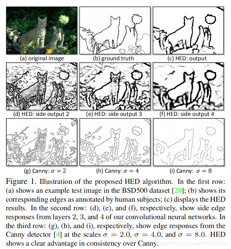 和deep supervision的网络。本文还通过采用预先训练的修剪后的VGGNet来初始化本文的网络结构和参数。本文的方法通过结合多尺度和多级视觉响应,在执行图像到图像学习方面显示出较好的结果,即使没有实施明确的上下文和高级信息。源代码和预训练模型获取地址: https://github.com/s9xie/hed