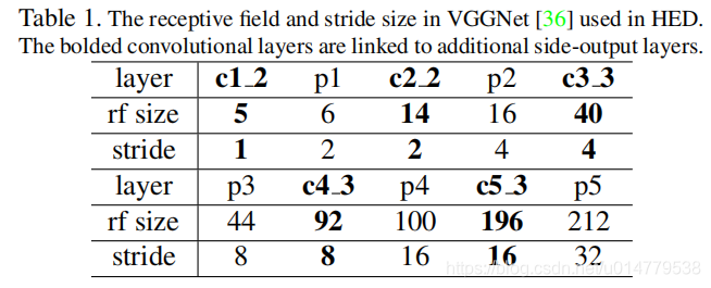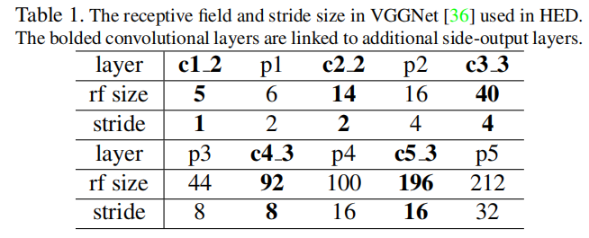 本文框架的层次结构选择值得一些思考。本文需要架构(1)更深入,以便有效地生成感知上的多级特征;(2)具有不同stages的多个阶段,一遍获得边缘图的固有尺度。本文还必须考虑训练这种深度神经网络的潜在困难,因为它从头开始便有多个stages的网络。最近,VGGNet在ImageNet挑战中体现了最先进的性能,其具有很大的深度(16 convolutional layer),高密度(stride-1 con- volutional kernels)和多个阶段(five 2-stride down- sampling layer)。最近的文献 [2]也证明了在一般图像分类任务上预训练的微调深度神经网络对于低级边缘检测任务是有用的。因此,本文采用VGGNet架构,但做出以下修改:(a)本文将side output层连接到每个级中的最后一个卷积层,分别为conv1_2,conv2_2,conv3_3,conv4_3,conv5_3。感知区间大小与这些卷积层中的每一个与相应的side output层相同;(b)本文减掉了VGGNet的最后一个阶段,包括第五个池化层r和所有全连接的层。“修剪”VGGNet的原因是有两点的。首先,因为本文期望具有不同尺度的有意义的side output,所以具有stride 32的层产生太小的输出平面,结果是插值的预测图将太模糊而无法使用。其次,完全连接的层(即使在重铸为卷积时)也是强度密集的计算,因此从pool5开始修剪层可以显着减少训练和测试期间的内存/时间成本。本文的最终HED网络架构有5个stages,分别有1,2,4,8和16 strides,并且具有不同的感知区间大小,全部嵌套在VGGNet中。表1 有关可接受的fields和strides的设置总结。