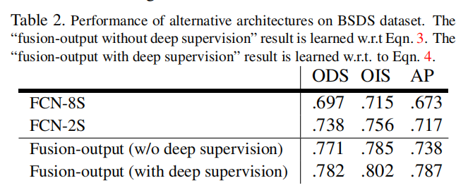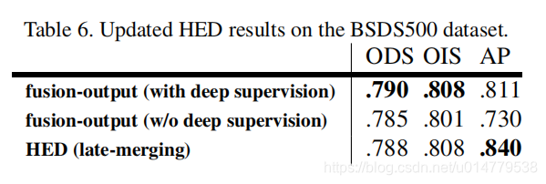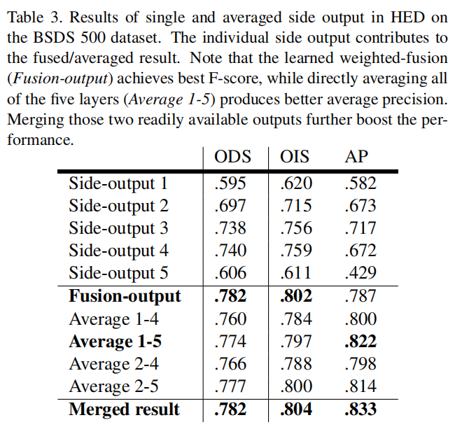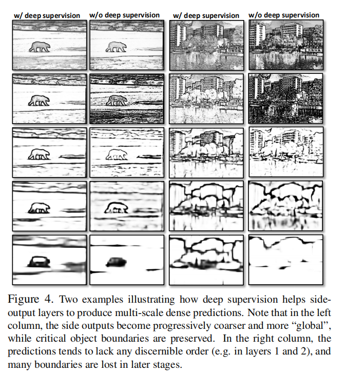 因为本文加入了连接每个side output layer的加权融合输出层,在此需要证明采用deep supervision(尤其是, ℓ s i d e ( m ) ( W , w ( m ) ) \mathcal \ell_{side}^{(m)}(W,w^{(m)}) ℓside(m)(W,w(m)):现在整个网络是连通的,输出层的参数可以通过加权融合层误差传播路径的反向传播来更新(受公式3影响)。本文表明deep supervision对于获得所需的边缘图很重要。本文提出的网络的关键特点是每个网络层应该扮演一个单一网络的角色,负责产生一定比例的边缘图。以下是基于上述两种变体的定性结果:(1)加权融合监督和deep supervision训练,(2)仅加权融合监督训练。本文观察到,在deep supervision下,嵌套的side output 是自然而直观的,获得的边缘图是由粗略到精细,从局部到整体的。另一方面,仅利用加权融合输出损失的训练给出了缺乏这种可辨别的顺序的边缘预测:在较高层side output处不存在许多临界边缘;在完全相同的实验设置下,基准数据集的结果(表格2的第三行)在F-score中仅略有差异,但显示出严重退化的平均精度;如果没有跨多个尺度的直接控制和指导,该网络严重偏向于学习大型结构边缘。