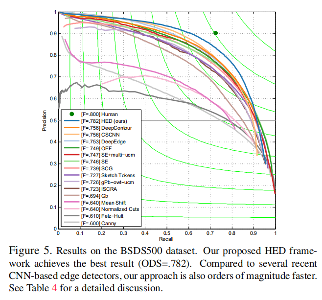 本文解决了在自然图像中检测边缘和目标边界的问题。这个问题对于各种计算机视觉领域都具有根本性和重要性,这些领域包括了视觉显著性、分割、目标检测/识别、跟踪和运动分析、医学成像、运动结构和3D重建等传统任务,以及自动驾驶、移动计算和图像-文本分析。人们早就明白,精确定位自然图像中的边缘涉及各种“层次”(levels)的视觉感知。相对全面的数据收集和认知研究表明虽然不同的目标却是在边缘和边界的位置上有不同的偏好,但是目标之间仍然存在特殊的一致性。例如文献[28]在一致性研究中达到F-score 080。