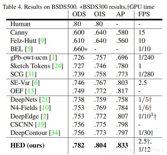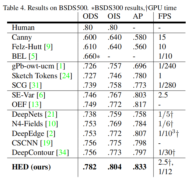 结构边缘(SE)主要关注以下三个方面:使用大量手工设计的特征(属性1),融合多尺度响应(属性2),以及合并结构信息(属性4)。使用CNN进行基于块的边缘预测的最近的工作,包含一个备选的共同思路,侧重于三个方面:自动特征学习(属性1),多尺度响应融合(属性2),以及不同级别的视觉感知(属性3)的参与。但是,由于缺乏深层监督(本文在方法中包含),在隐藏层中产生的多尺度响应因为反馈必须通过中间层反向传播,所以在语义上意义较小。更重要的是,块到像素或块到块的策略会导致训练和预测效率显着降低。通过“holistically-nested”,本文提出的端到端边缘检测系统,这是一种受完全卷积神经网络启发的策略,但在修剪的VGG网络顶部进行额外的deep supervision(如图3所示)。在没有深刻监督和侧面输出的情况下,完全卷积网络(FCN)由于边缘检测需要高度精确的边缘像素定位,因此(FCN)产生的结果不如HED(例如BSD500上的F-score .745)。值得一提的是,本文的图像到图像训练和预测策略仍然没有明确地使用上下文信息,因为在HED中不直接强制对相邻像素标签的约束。除了基于块的CNN边缘检测方法的速度增益之外,性能增益主要归功于三个方面:(1)类似FCN的图像到图像训练允许我们同时训练大量的样本(见表4);(2)我们模型中的deep supervision指导学习更明显的特征(见表2);(3)在端到端学习中插入side output,激励每层的连续影响(见表3)。