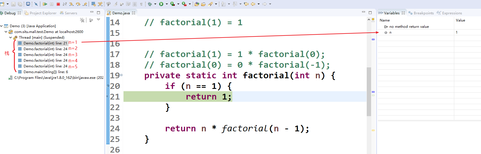 当然了,我肯定是使用一个最简单的递归出口了:if(n=1) return 1