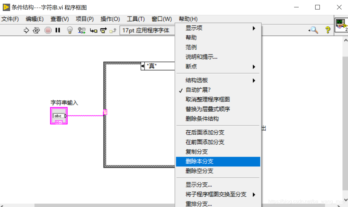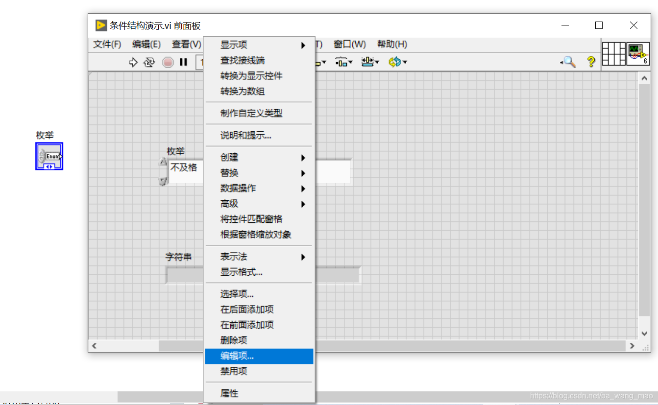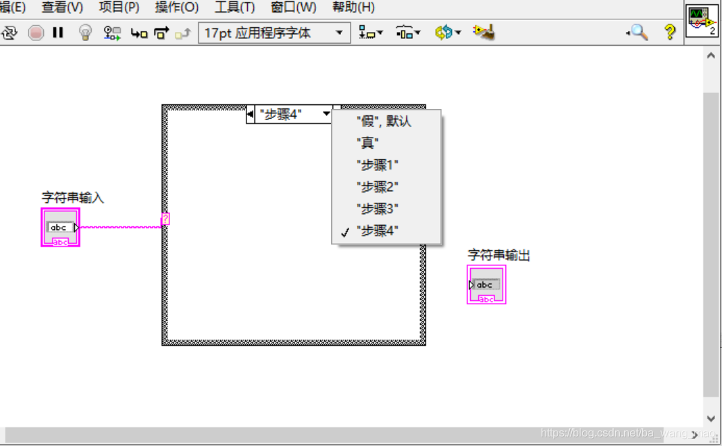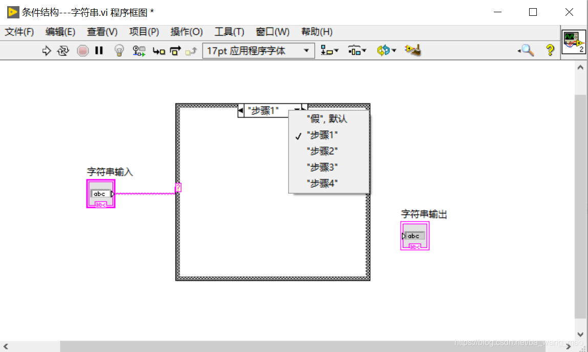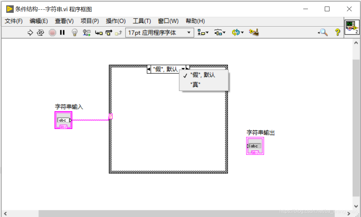 程序面板添加1个条件结构,字符串输入和条件结构连接,参见下图,下拉项只有两项,分别是“假”字符串和“真”字符串,其中下拉项“假”字符串为默认。