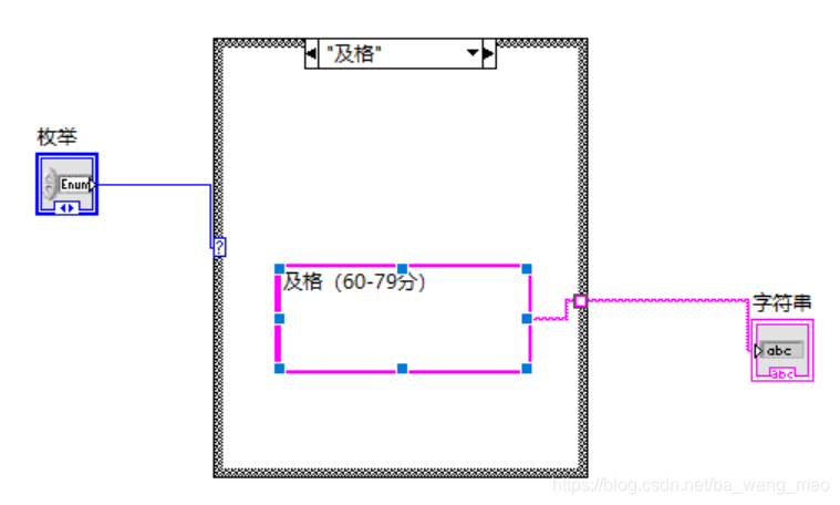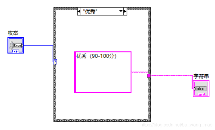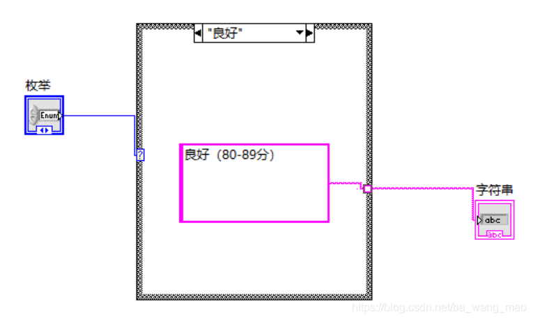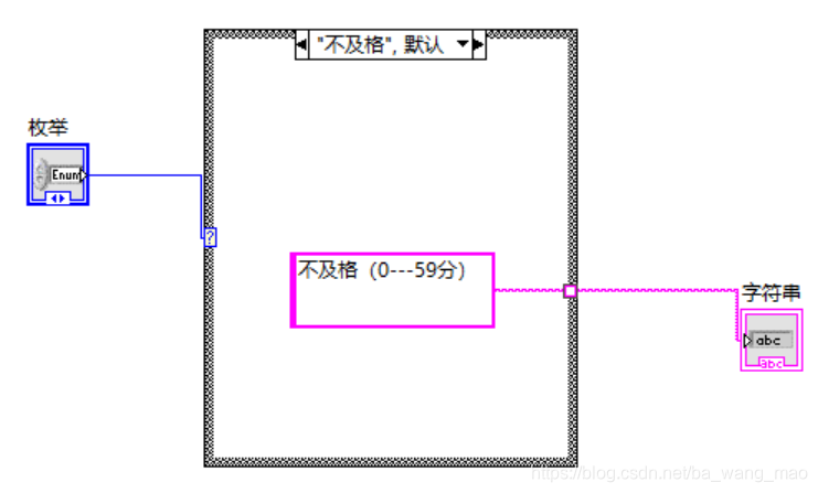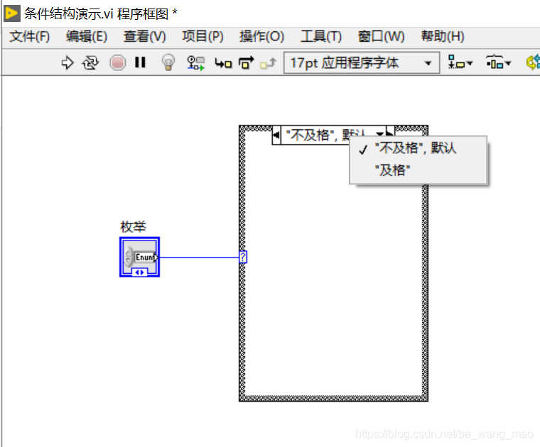 这种枚举型的条件输入,在LabVIEW中应该是最正宗的条件结构了,类似于C语言的“switch……case……”结构,并且在创建分支时,可在右键菜单中选择“为每个值添加分支”,此时程序会自动为枚举类型输入变量中的每个值创建一个分支框,省去了手动添加每个分支的过程,添加分支后,再将其中的一个分支设置为默认分支即可。一个简单的示例程序框图代码如下图所示: