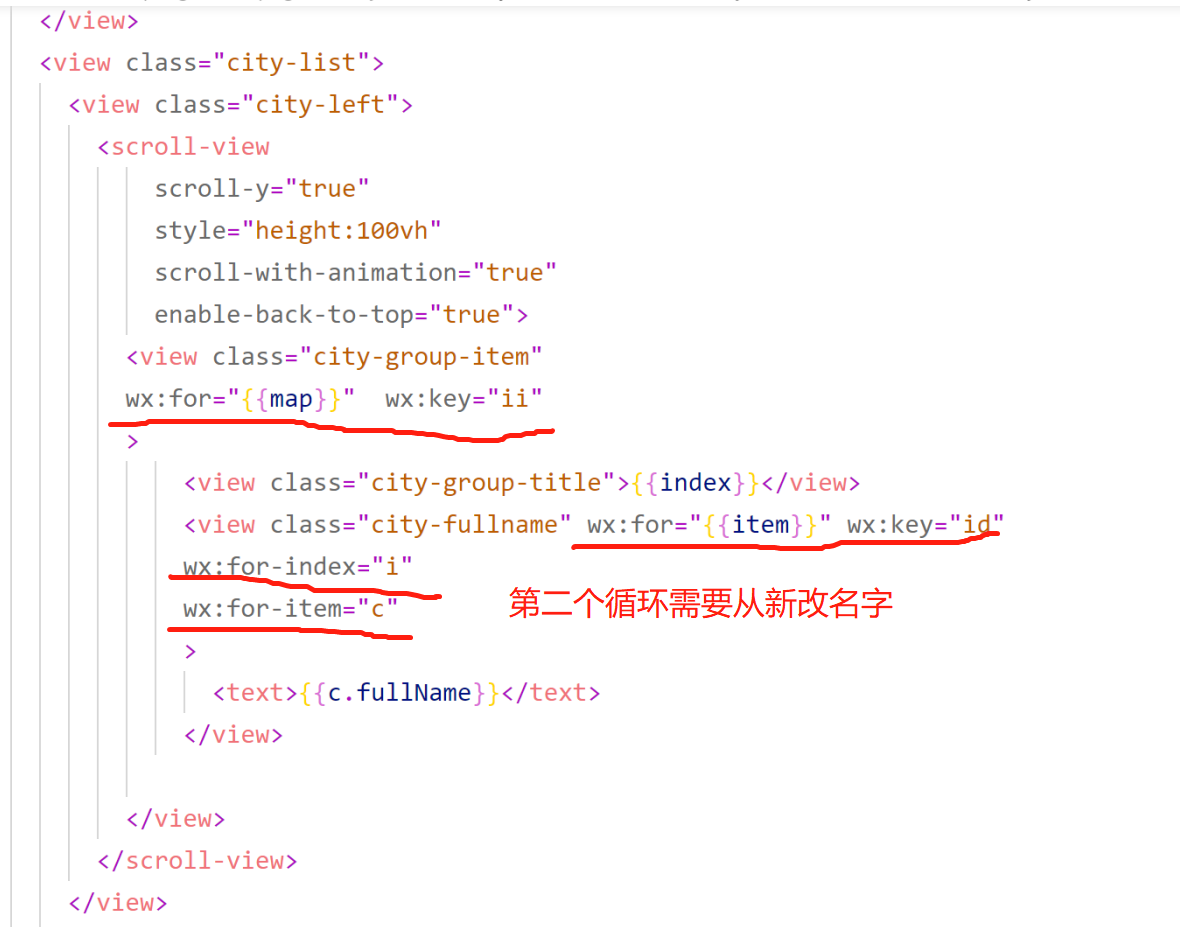 <view class="city-fullname" wx:for="{{item}}" wx:key="id"
