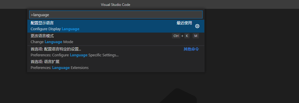 使用快捷键【Ctrl+Shift+P】弹出查找命令框,输入language,找到Configure Display Language,点击,提示安装中文插件,如下图所示: