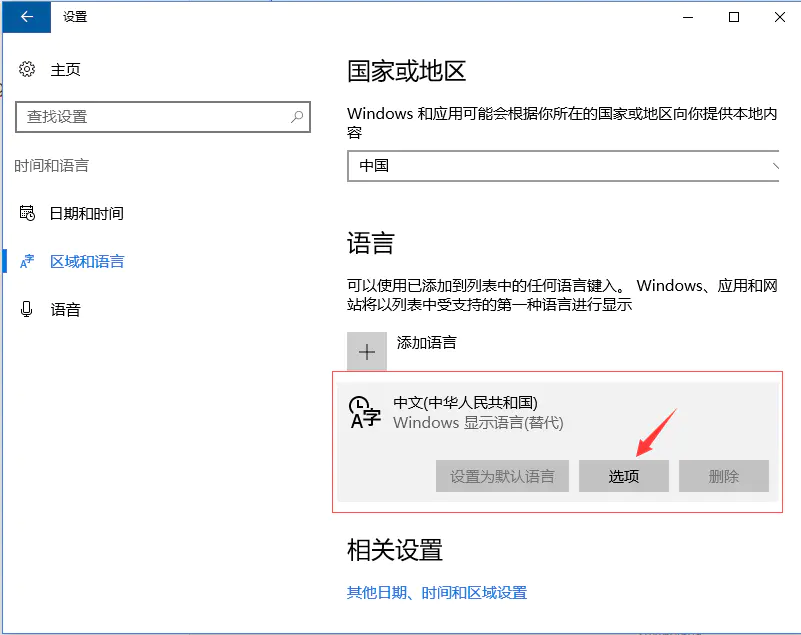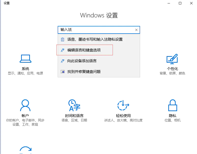 1. 开始菜单选择设置然后搜索"输入法"-->选择"编辑语言和键盘选项"