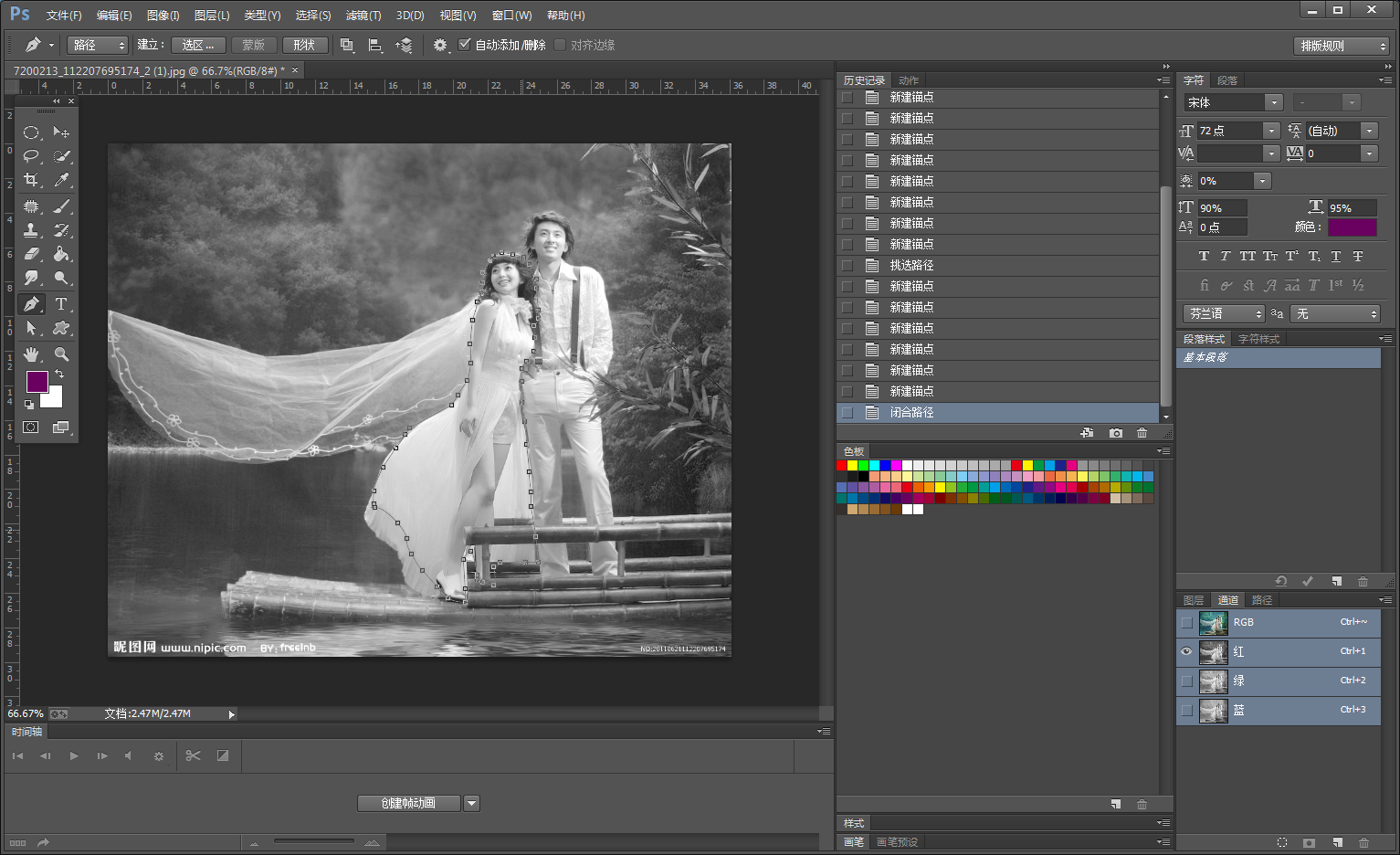 2、进入通道界面。选择色差最大的通道,这里是红通道。然后选择钢笔工具选择“路径”,沿人物轮廓不透明部分绘制路径,注意不要将透明部分画里面。