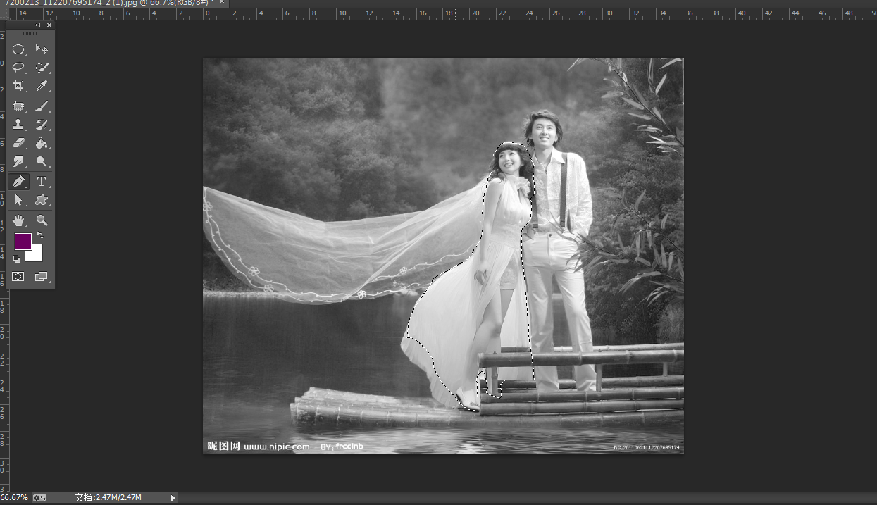 6、用快速选择工具,选出透明婚纱及人物轮廓,然后按CTRL+SHIFT+I反选背景,按ALT+DELETE填充背景色为黑色。CTRL+D取消选区,如图所示;