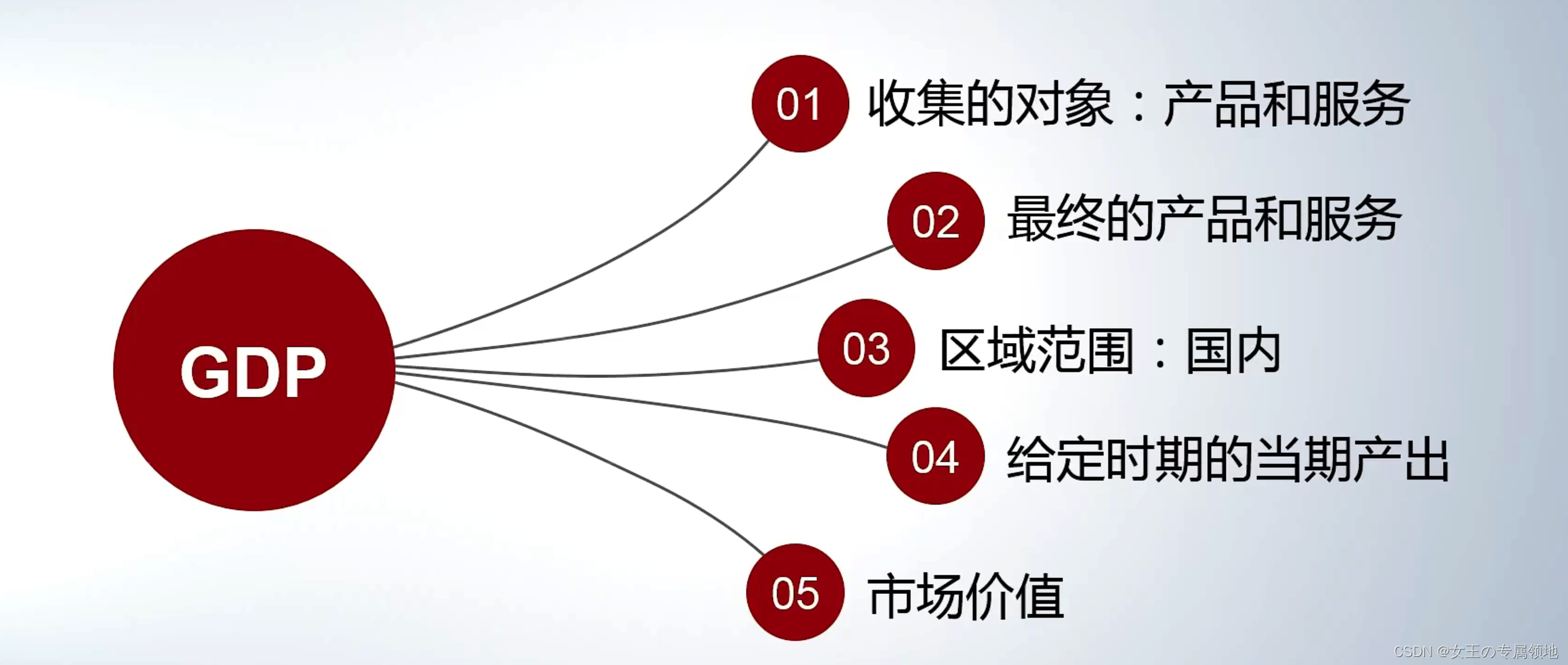 定义:关于产出的指标,指的谁一个国家或者地区在给定时间内新增的最终产品和最终服务的总价值。