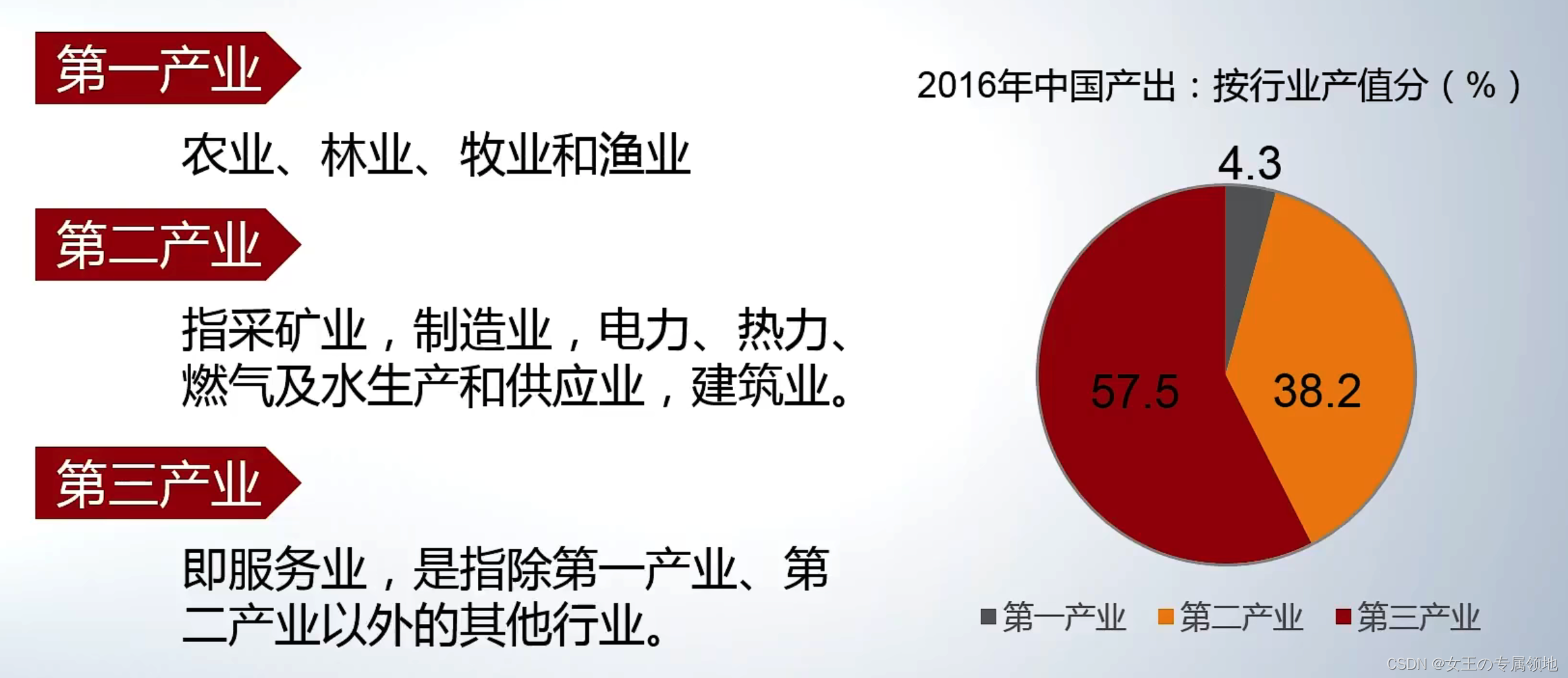 - 服务:没有物质形态的产出。比如去音乐会听了一首歌。