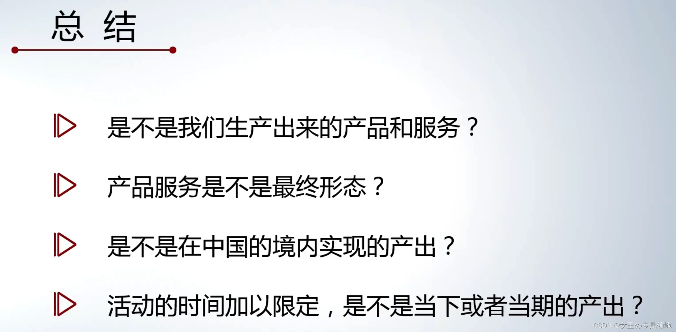 💡 衡量一个经济活动是不是应该被统计到GDP里面的方法,就需要从以上几个角度考量: