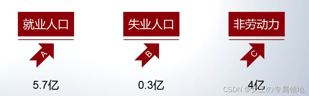 - 劳动人口:包括那些有劳动意向的人,即就业人口和失业人口。(劳动人口=5.7+0.3=6亿)