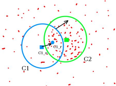 meanshift 背后的直觉很简单。考虑你有一组点。(它可以是像直方图反投影这样的像素分布)。您有一个小窗口(可能是一个圆圈),您必须将该窗口移动到最大像素密度(或最大点数)的区域。如下图所示:
