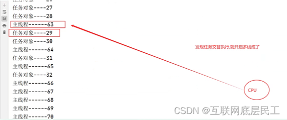 public class UseMyRunnable {public static void main(String[] args) {// 3.创建任务类对象MyRunnable m1 = new MyRunnable();// 4.创建线程对象,把任务对象绑定到线程中Thread t1 = new Thread(m1);t1.start();for (int i = 0; i < 100; i++) {System.out.println("主线程------"+i);}}
