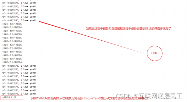 public class UseMyCallable {public static void main(String[] args) throws ExecutionException, InterruptedException {// 3.MyCallable对象MyCallable mc = new MyCallable();// 4.创建一个FutureTask对象, 把MyCallable绑定到未来任务对象中FutureTask<String> task = new FutureTask<>(mc);// 5.把未来任务对象绑定到Thread类中Thread t = new Thread(task);t.start();for (int i = 0; i < 100; i++) {System.out.println("主线程-女生不要答应");}// 一定要在线程开启之后,在调用get方法,否则线程就没有开启的机会.String result = task.get();System.out.println("女神的反馈:"+result);}