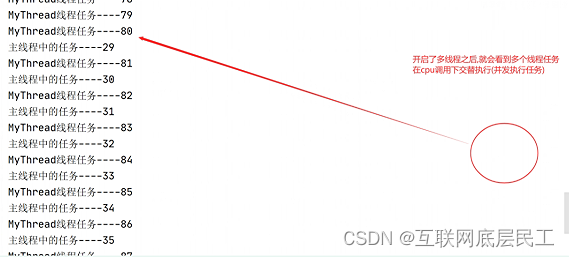 public static void main(String[] args) {// System.out.println( 1 / 0);// 创建一个MyThread对象MyThread mt = new MyThread();// 调用start方法开启线程mt.start();// mt.run(); 千万不要调用run方法,因为并没有开启线程,只是一个对象调用一次方法而已.// 这个循环属于main方法所在的线程,就是换一个叫做"main"线程,这线程就是主线程for (int i = 0; i < 100; i++) {System.out.println("主线程中的任务---" + i);}}