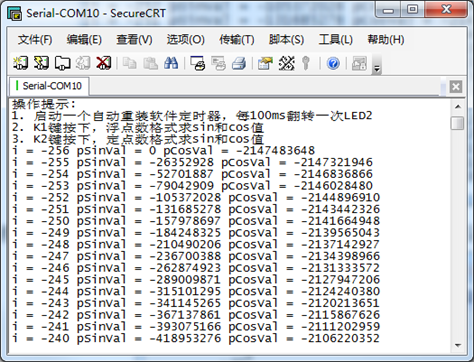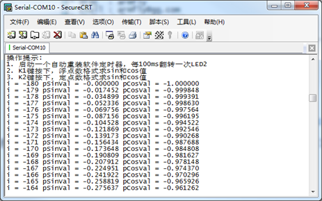 /* ********************************************************************************************************* * 函 数 名: DSP_SIN_COS * 功能说明: 浮点数cos和sin计算 * 形 参: 无 * 返 回 值: 无 ********************************************************************************************************* */ static void DSP_SIN_COS(void) {int16_t i;float32_t pSinVal;float32_t pCosVal;for(i = -180; i < 180; i++){arm_sin_cos_f32(i, &pSinVal, &pCosVal); printf("i = %d pSinVal = %f pCosVal = %f\r\n", i, pSinVal, pCosVal);} }