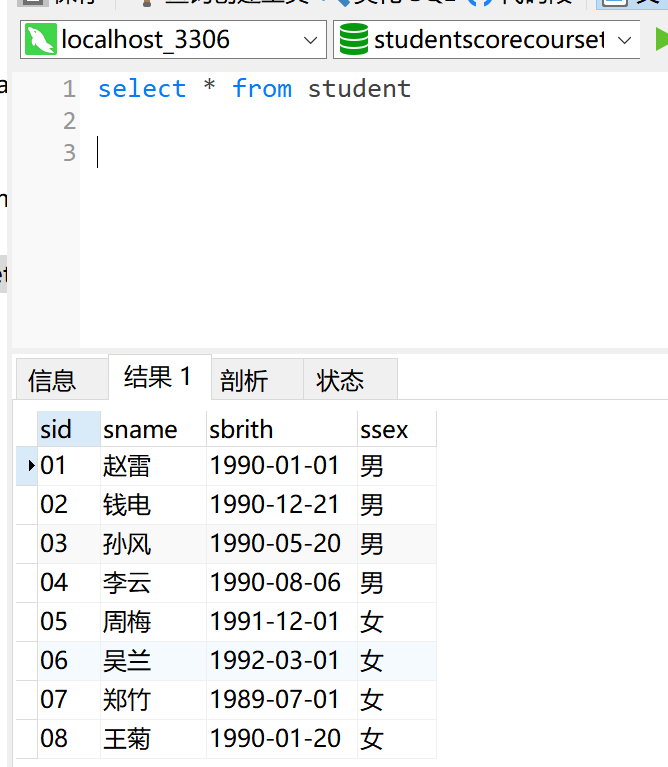 Student(s_id,s_name,s_birth,s_sex) –学生编号,学生姓名, 出生年月,学生性别