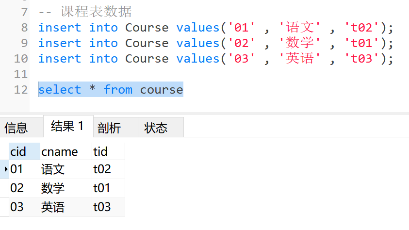 insert into Course values('03' , '英语' , '03');-- 成绩表数据