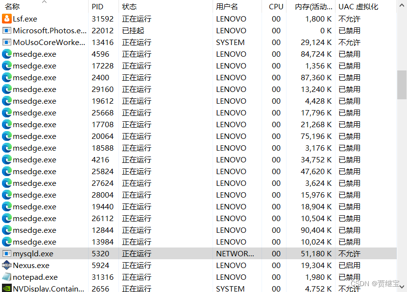 3.看到当前端口被占用情况后,打开任务管理器,在详细信息中找到对应的PID结束任务。