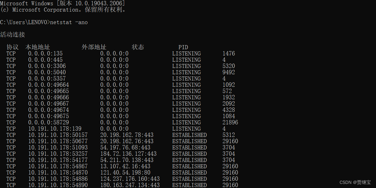 1.win+r 然后cmd命令行,输入netstat -ano查看所有端口信息
