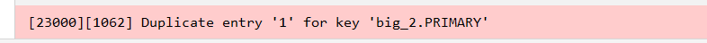 [23000][1062] Duplicate entry '1' for key 'big_2.PRIMARY' 看报错,是big_2的主键已经有1了,不能再插入相同的值,我这边id是自增字段,指定插入字段就能解决,调整下插入语句即可
