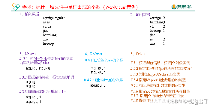import org.apache.hadoop.mapreduce.lib.output.FileOutputFormat;import java.io.IOException;public class WordCountDriver {public static void main(String[] args) throws IOException, ClassNotFoundException, InterruptedException {//1 获取JobConfiguration conf = new Configuration();Job job = Job.getInstance(conf);// 2设置jar包路径job.setJarByClass(WordCountDriver.class);//3 关联mapper和reducejob.setMapperClass(WordCountMapper.class);job.setReducerClass(WordCountReducer.class);//4 设置map输出的k,v类型job.setMapOutputKeyClass(Text.class);job.setMapOutputValueClass(IntWritable.class);//5 设置最终输出的k,v类型job.setMapOutputKeyClass(Text.class);job.setOutputValueClass(IntWritable.class);//6 设置输出路径和输出路径FileInputFormat.setInputPaths(job,new Path("D:\\input\\inputword"));//默认按行读取FileOutputFormat.setOutputPath(job,new Path("D:\\output\\output5"));//7 提交jobboolean result = job.waitForCompletion(true);System.out.println(result?0:1);}}