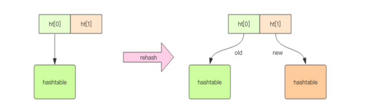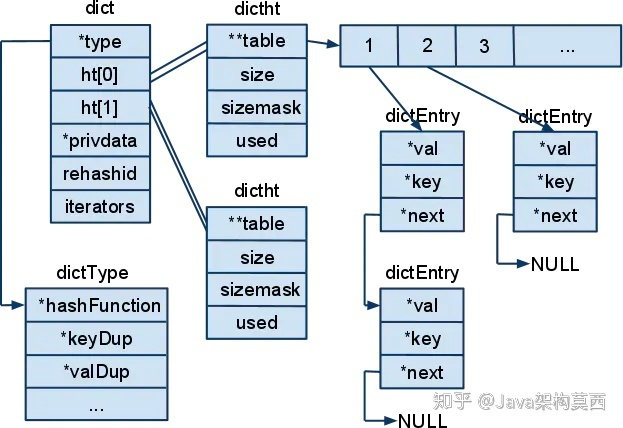 typedef struct dict {// 类型特定函数dictType *type;// 私有数据void *privdata;// 哈希表,两个元素dictht ht[2]// rehash时记录的索引下标,当没有rehash时,值为-1int rehashidx;} dict;