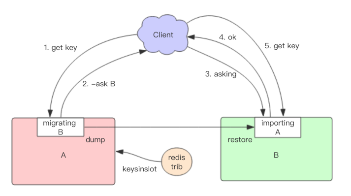 首先新旧两个节点对应的槽位都存在部分 key 数据。客户端先尝试访问旧节点,如果对应的数据还在旧节点里面,那么旧节点正常处理。如果对应的数据不在旧节点里面,那么有两种可能,要么该数据在新节点里,要么根本就不存在。旧节点不知道是哪种情况,所以它会向客户端返回一个-ASK targetNodeAddr 的重定向指令。客户端收到这个重定向指令后,先去目标节点执行一个不带任何参数的 asking 指令,然后在目标节点再重新执行原先的操作指令。