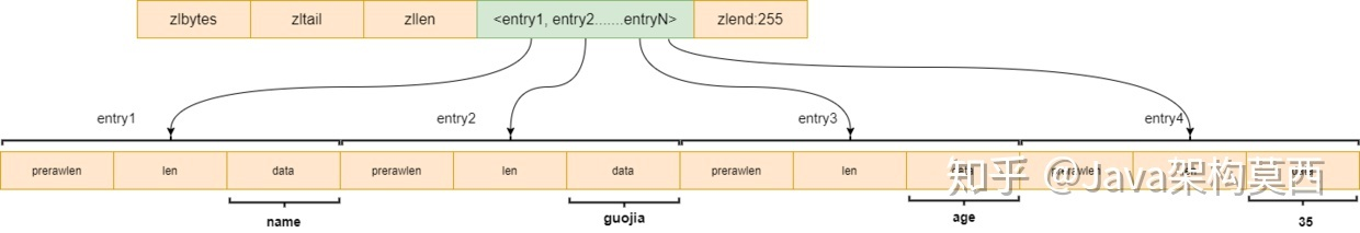 上图中可以看到,当数据量比较小的时候,我们会将所有的key及value都当成一个元素,顺序的存入到ziplist中,构成有序。