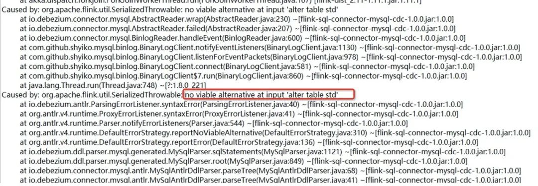 作业在运行时 mysql cdc source 报 no viable alternative at input 'alter table std'