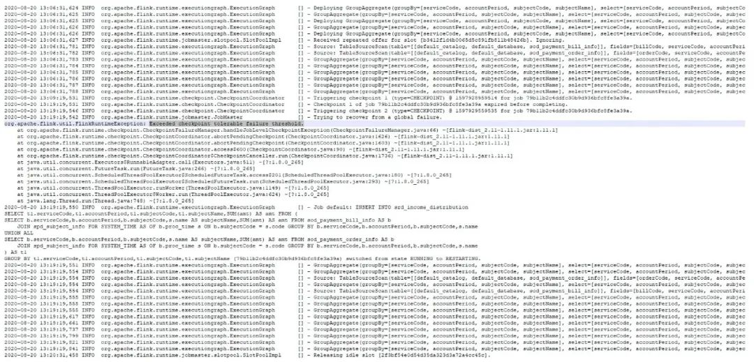 原因:Flink CDC 在 scan 全表数据(我们的实收表有千万级数据)需要小时级的时间(受下游聚合反压影响),而在 scan 全表过程中是没有 offset 可以记录的(意味着没法做 checkpoint),但是 Flink 框架任何时候都会按照固定间隔时间做 checkpoint,所以此处 mysql-cdc source 做了比较取巧的方式,即在 scan 全表的过程中,会让执行中的 checkpoint 一直等待甚至超时。超时的 checkpoint 会被仍未认为是 failed checkpoint,默认配置下,这会触发 Flink 的 failover 机制,而默认的 failover 机制是不重启。所以会造成上面的现象。